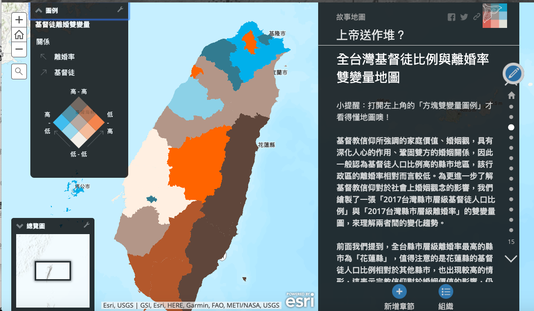 其實,近年來很注重「婚姻價值」的基督徒信仰群體內部,相信「另一半」是上帝所預備的,在基督教經典聖經《新約》中的馬太福音19章4-6節寫道: 「.....夫妻不再是兩個人,乃是一體的了。所以,神配合的,人不可分開。」 因為是神配合的,人不可分開。基督徒群體當中,兩人得以結婚就像是「上帝送作堆」。因此本故事地圖(Story Map)一開始,以全台灣地區為尺度,看基督徒比例高的地方,是否因為上帝的配合,離婚率比較低,接著我們會抽絲剝繭地來分析這些現象。