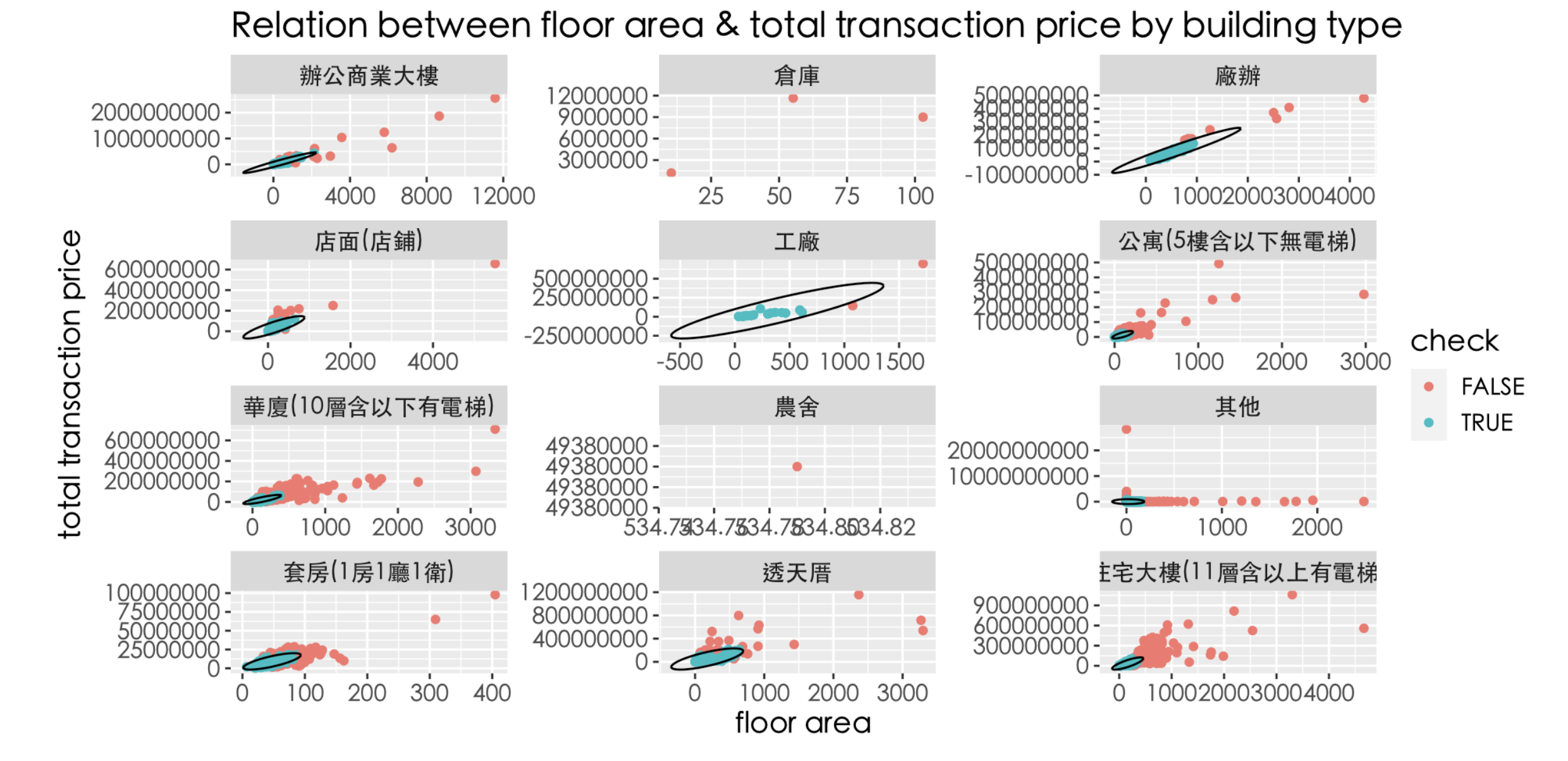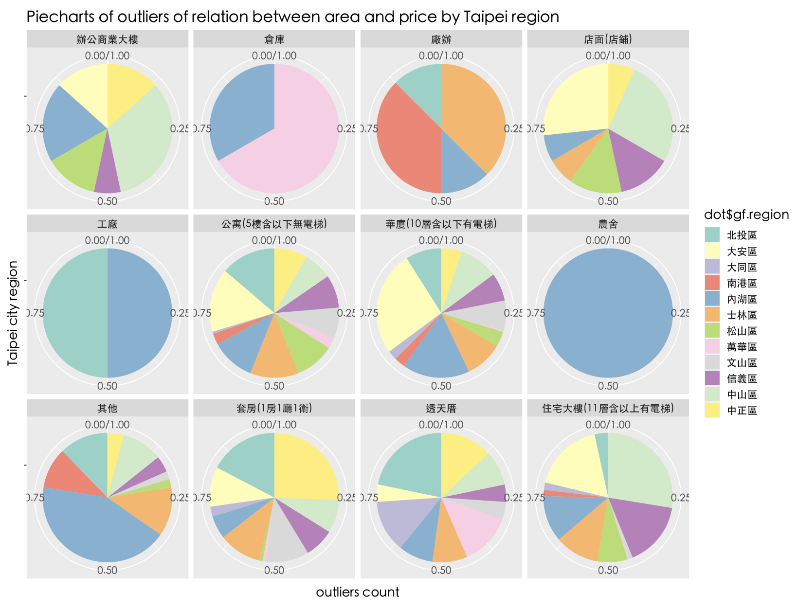 This work use R langauge to code and draw many statistical charts. In this project, I found in house price, the outlier’s geogrpahical variance is the most distinguishable in 住宅大樓,the hot spot is 中山區 followed by 大安區、信義區。 in type of 公寓,hotspot is in 北投區。in type of 套房,hotspot is in 中正區。in type of 華廈,the hot spot is in 大安區 follwed by 內湖區。in 商業辦公大樓,hotspot is in 中山區。in 透天屋,the hot spot is in 北投區。