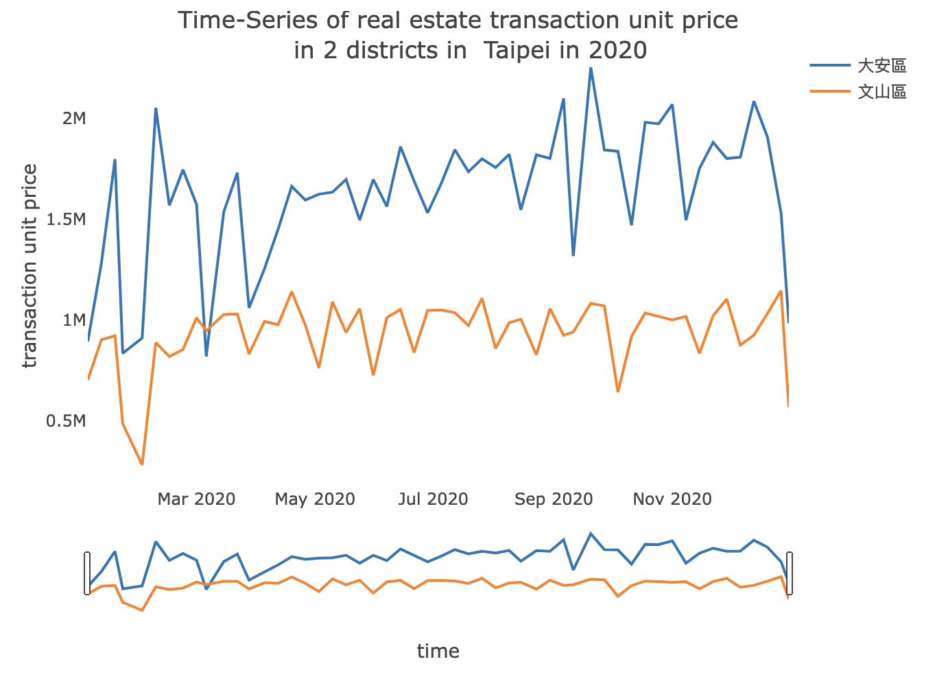 Gerally speaking, Daan district possess higher unit price in real estate transaction in 2020 than Wenshan district in Taipei city, Taiwan. However, during some short period of time, for example, 1st-15th,March, the average unit prices in transaction in Wenshan district is higher the Daan’s ones.