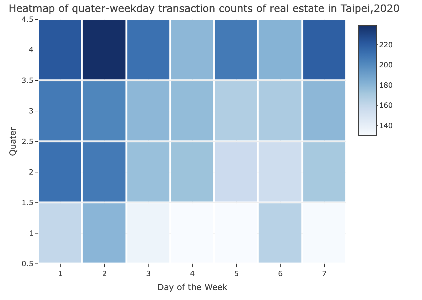 Real estate transaction in Taipei city, in 2020. The 4th quater, which is Oct-Dec,2020, possess higher count of transaction. The transaction has higher frequency occured in Sunday and Monday. This may be something to do the fact that most of people check and consider the house or dealing with real estate agent during weekends (free day). Accordinly, the time-series of transactions of quater and weekday result in this kind of characteristic.