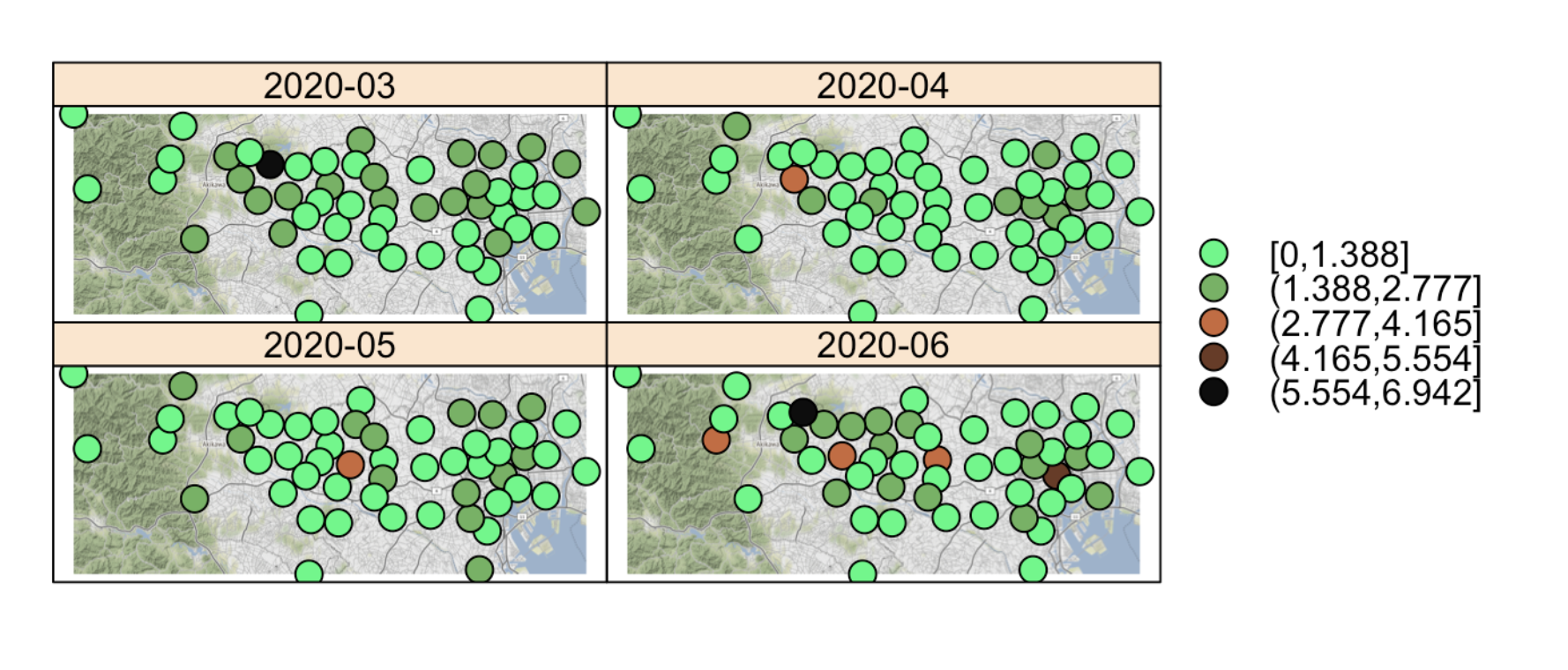 The project shows the suicide rate spatial distribution in Tokyo city, Japan from March, 2020 to December, 2020. COVID-19 outbreak began in March, 2020 and still happening. We can view March-June, 2020 as the 1st wave of virus outbreak and July-December, 2020 as 2nd wave of virus outbreak. As we can see in the figure, the suicide rate is the highest in the west and middle tokyo in the first wave and there are some place in the DOWNTOWN tokyo begin to possess high suicide rate in the 2nd wave.