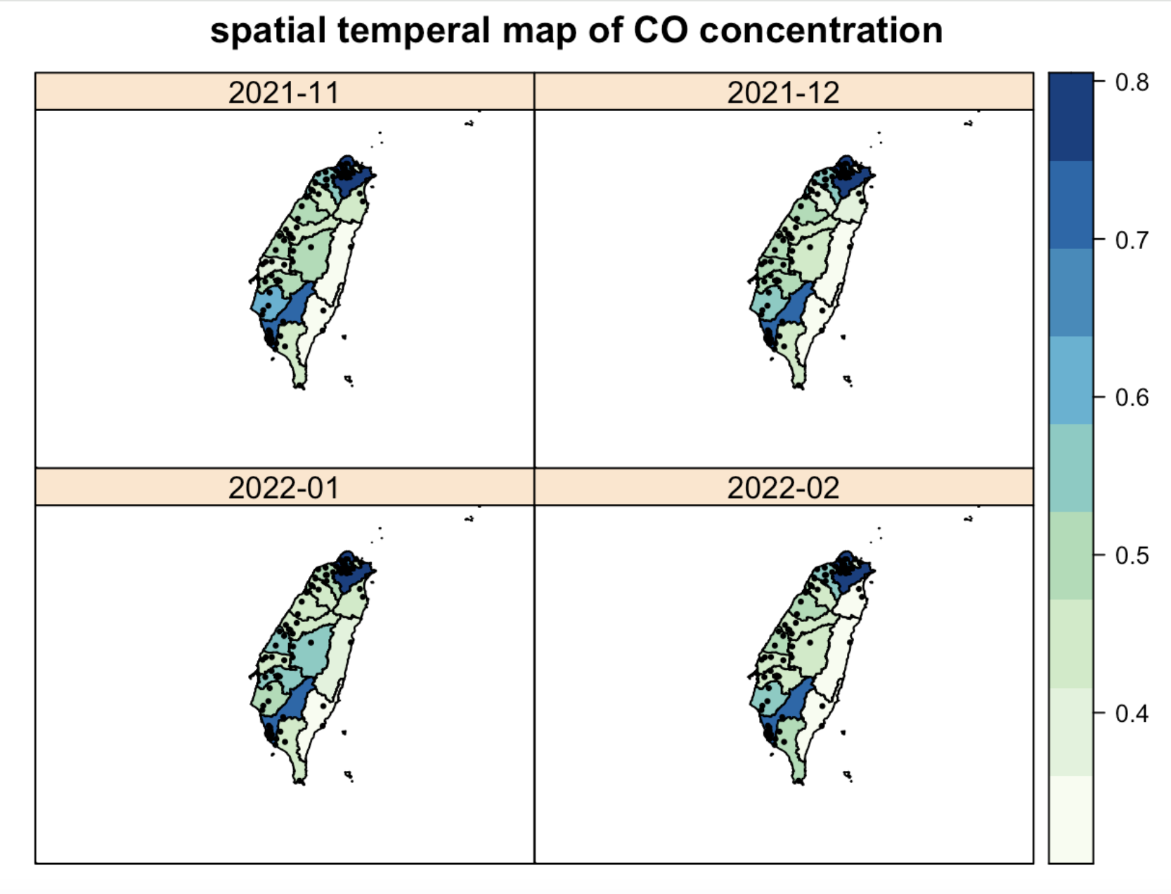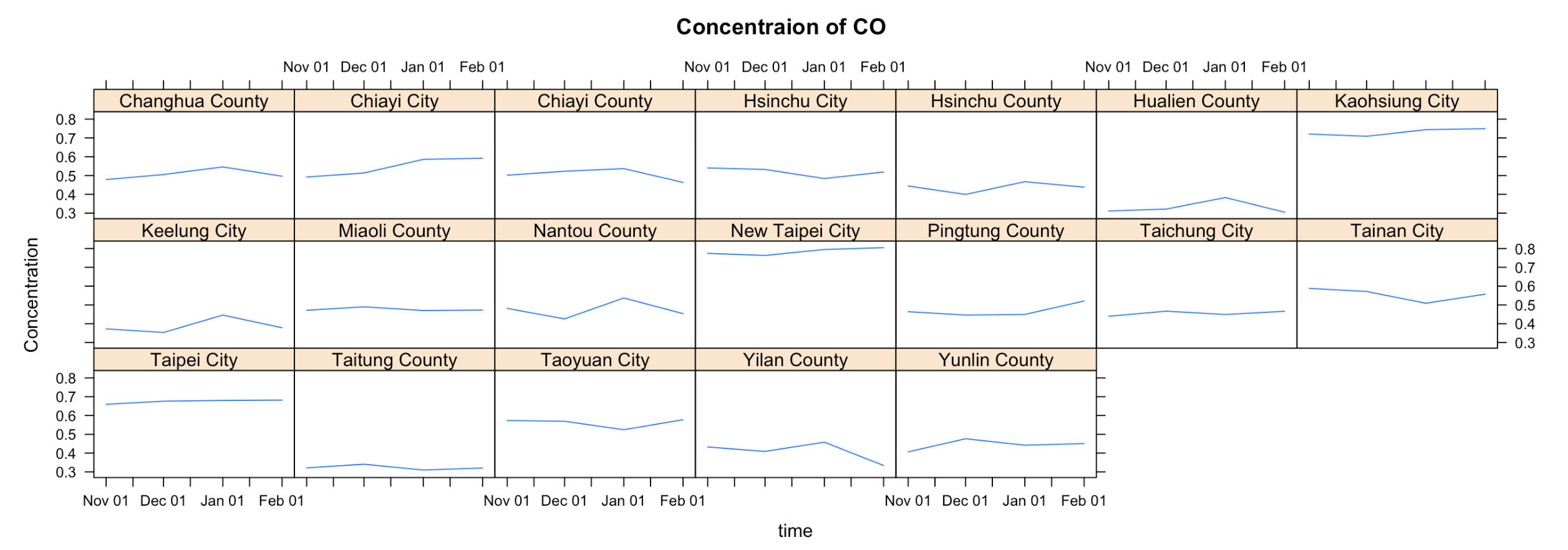 This work use R langauge to code and draw charts for data visualization. Data: EPA_daily.csv Comparing county-level monthly air pollution in time and space from Taiwan EPA monitoring data Original scale: X-Y point (space); daily (time) Upscaling to county-level (space) and monthly (time) Plotting [1] Using stplot() for plotting county-level monthly air pollution in time and space [2] Creating boxplot for comparing air pollution among counties