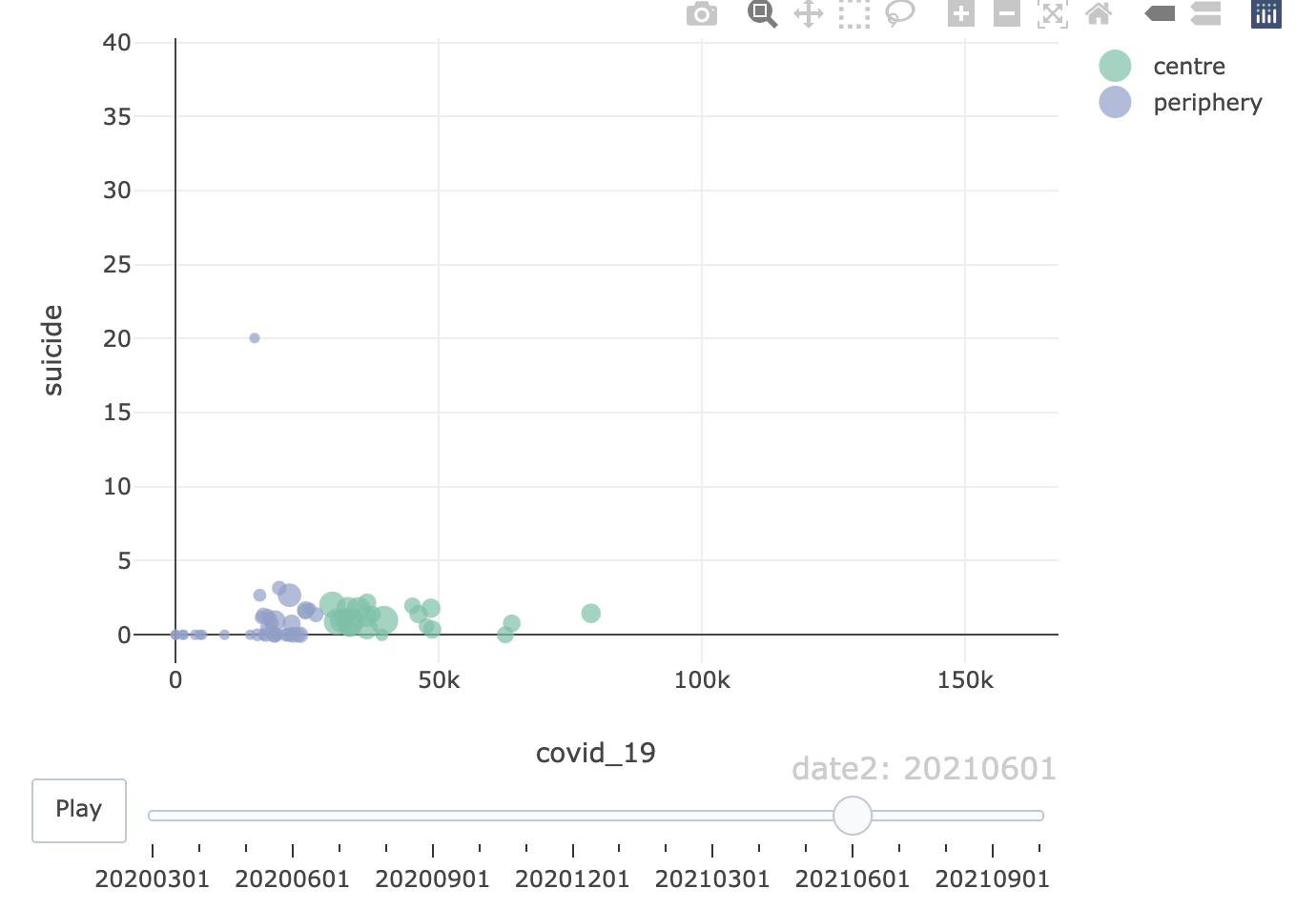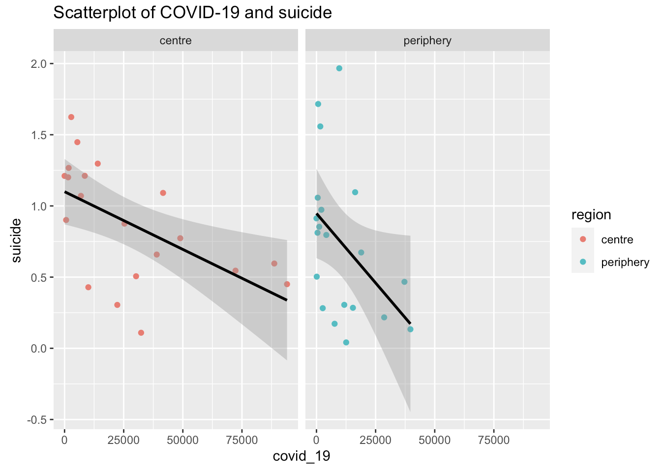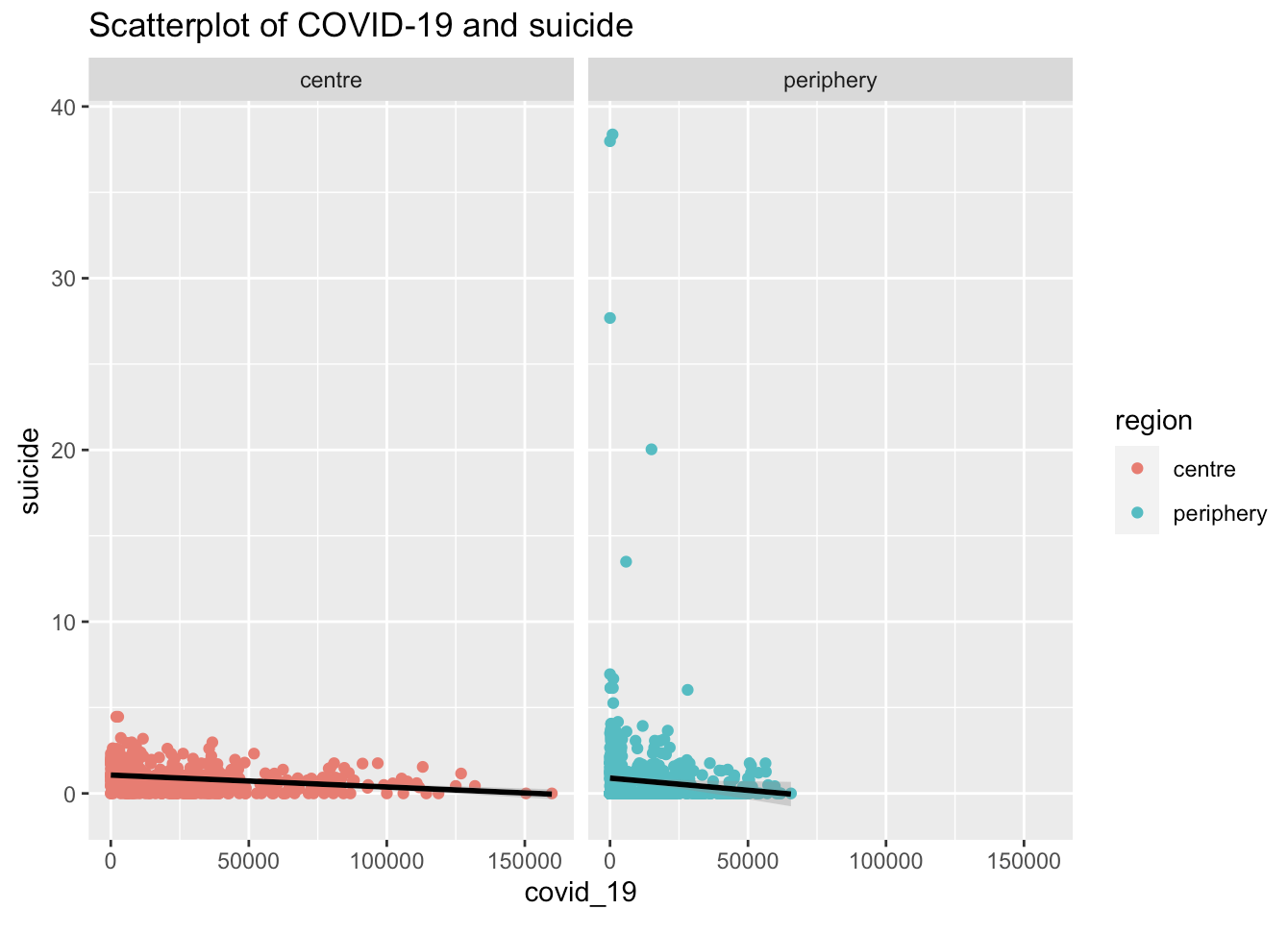 In this work, I wonder Question 1: In Tokyo, Japan, did regions with high COVID-19 cases lead to high suicide rate ? Question 2: Did the relationship of COVID-19 and suicide differ among centre Tokyo and Peripheral Tokyo ?