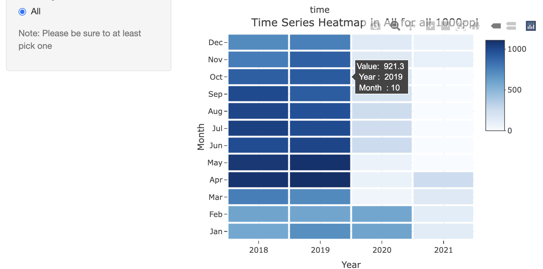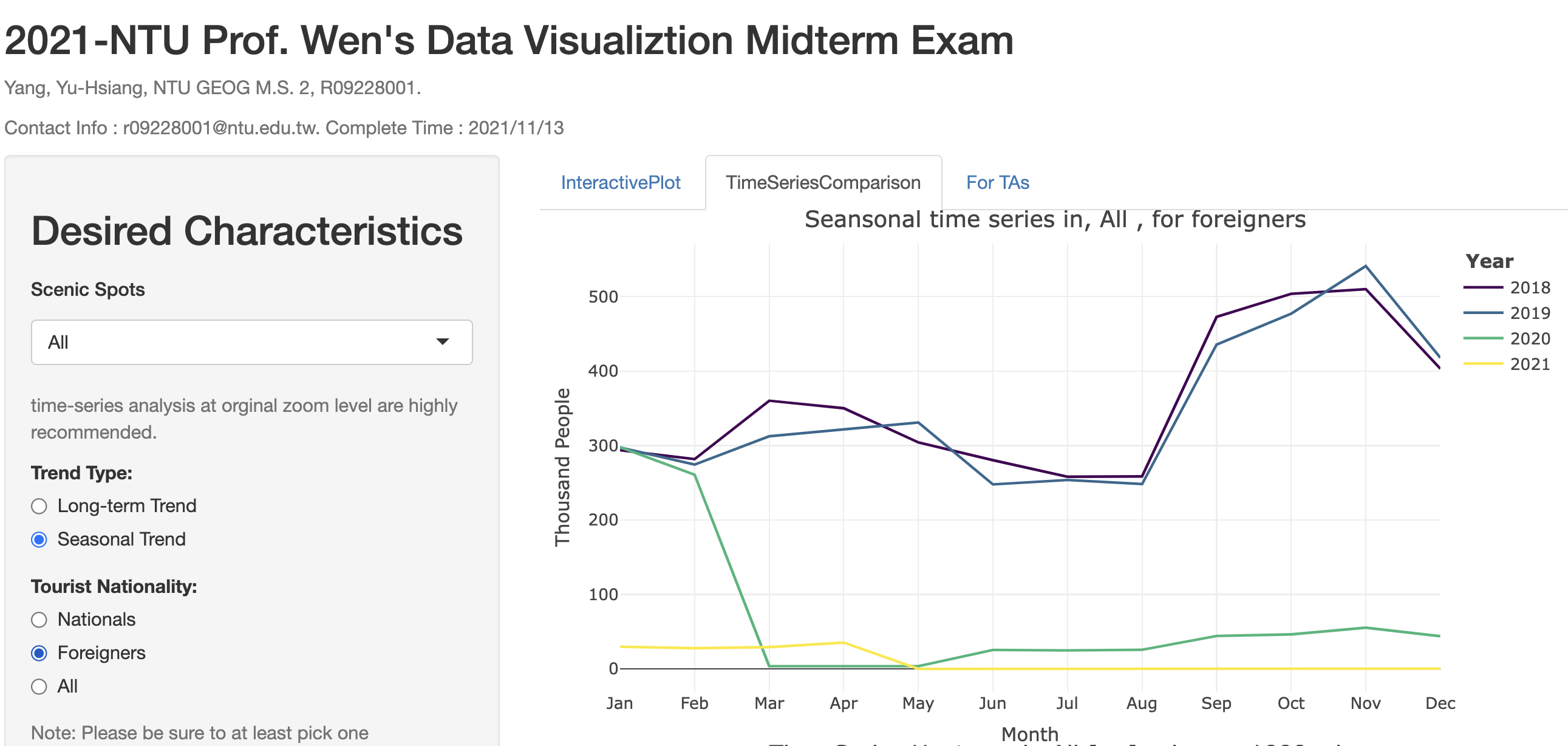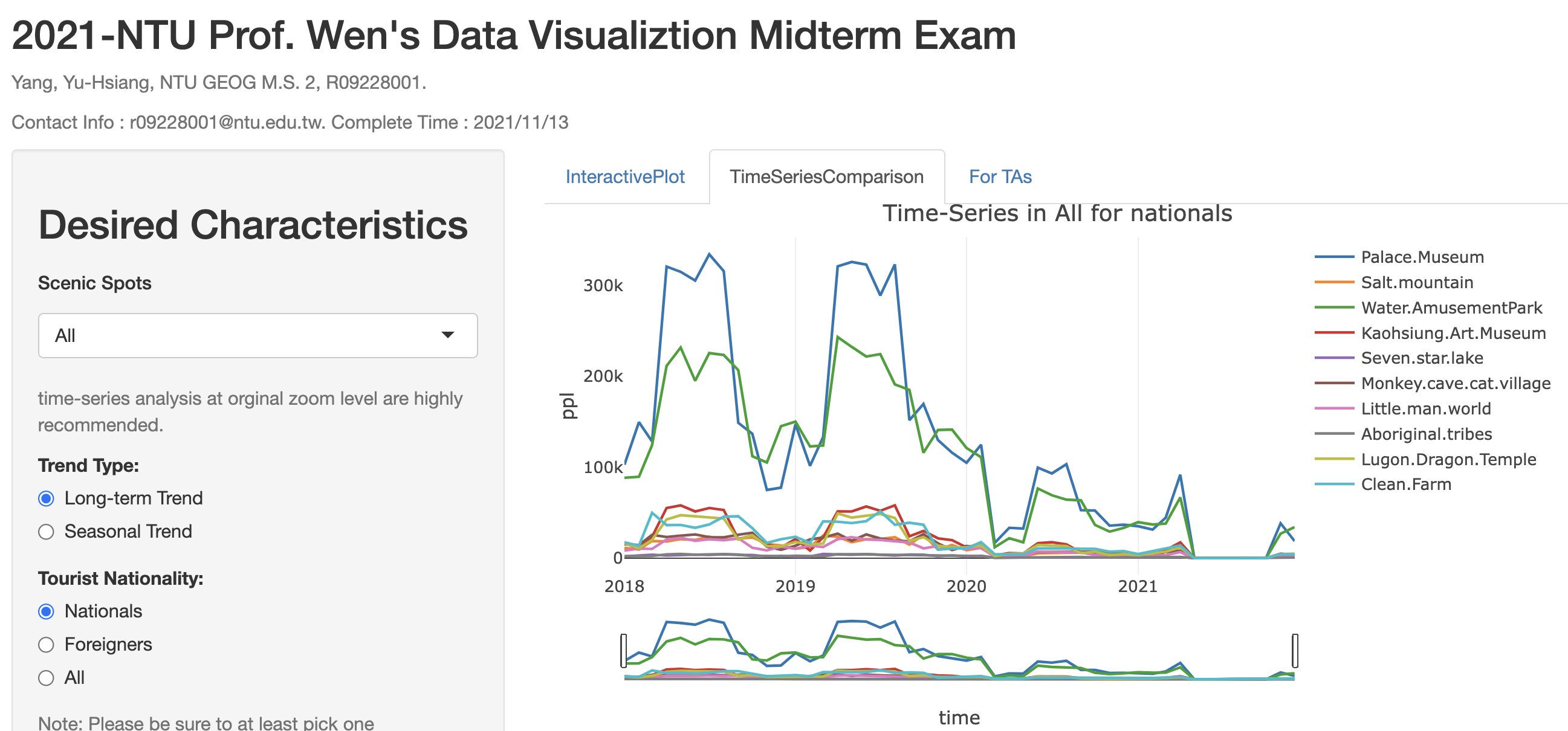 This work use R langauge with shiny package to conduct a user-control shiny App. In this work, the theme is Taiwan Tourism Data.In order of compare the seasonality of visitors in different tourist spots, I generated the seasonal plots and heat maps for seasonality of time series respectively on my webpage link. When we compare 10 tourist spots, for Palace Museum, April-May seems as a popular season; for salt mountain, June-Aug and Nov.-Feb seems to be popular seasons; for water amusement park, April-May seems to be a popular season; for Kousiung art museum, April and may seems to be a popular season; for seven star lake, June-Aug seems to be a popular season; for monkey cave cat village, June-Aug seems to be a popular season ; for little man world, April and may seems to be a popular season; for Aboriginal tribes, April and may seems to be a popular season and for Lugon dragon temple, April-Octobers seems to be a popular long season and finally, for clean farm, June-Aug seems to be a popular season . Overall, the spring vacation and summer vacation appear to be the high spot seasons for visitors in these tourist spots (refer to Appendix).
