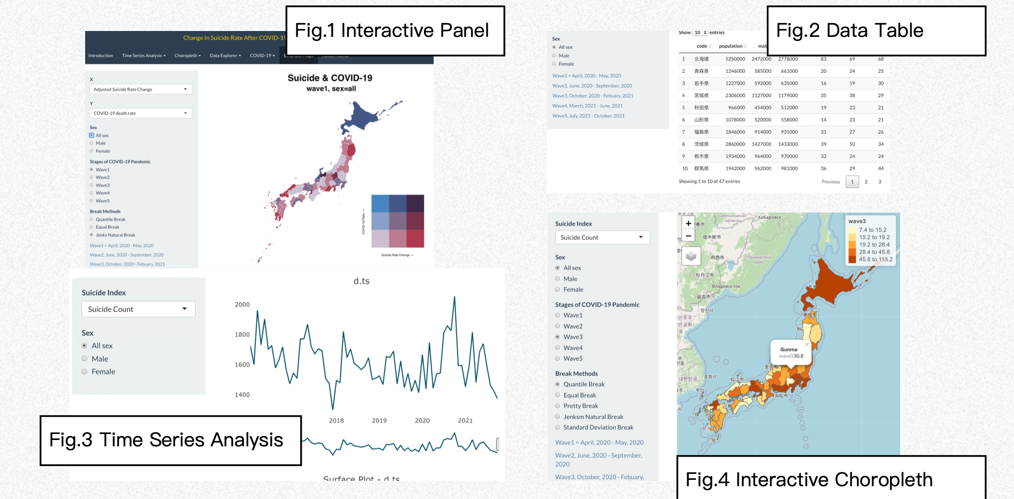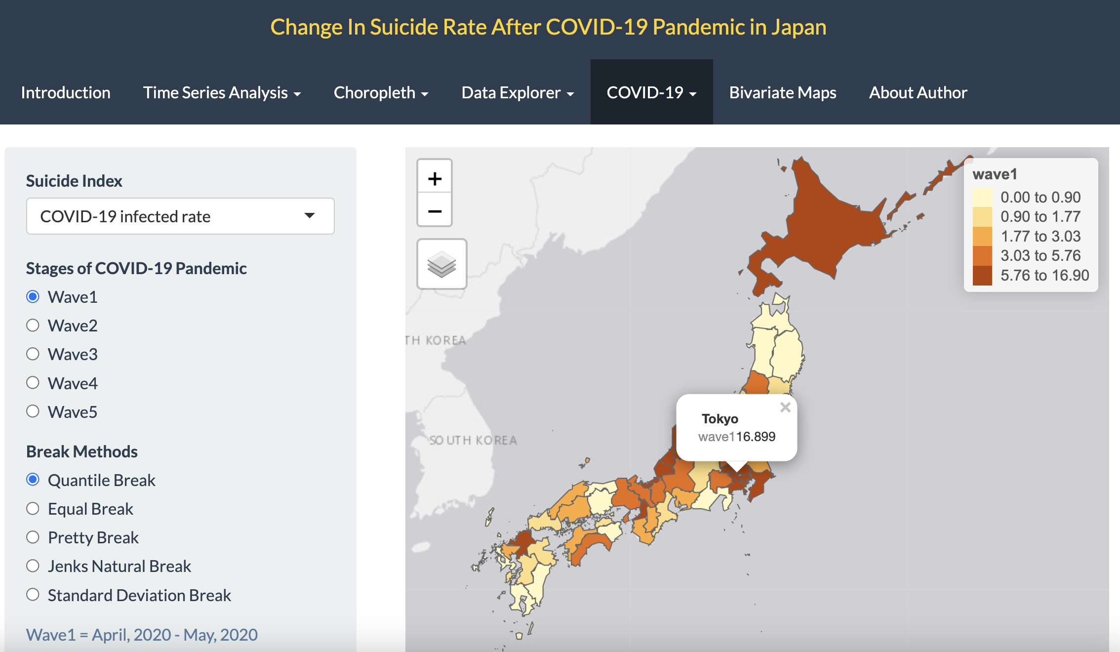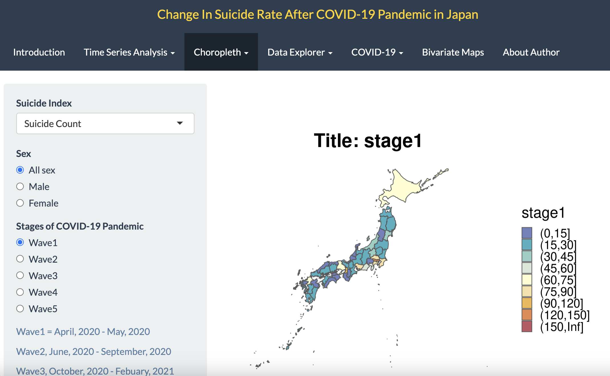 As the result, I created several panels in my pages. Firstly, Introduction panels is for introduce 47 prefecture locations in Japan. Secondly, I showed time series of suicide count, suicide rate, change in suicide rate, adjusted change in suicide rate. Thirdly, Choropleths were made to investigate the spatial pattern of suicide index. Fourthly, data table with both suicide and COVID-19 are available on my page. Fifthly, time series and choropleth of COVID-19 infected and death were plotted.