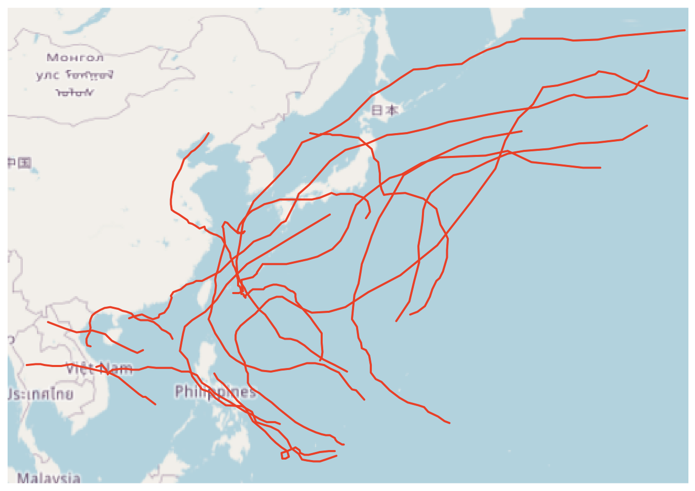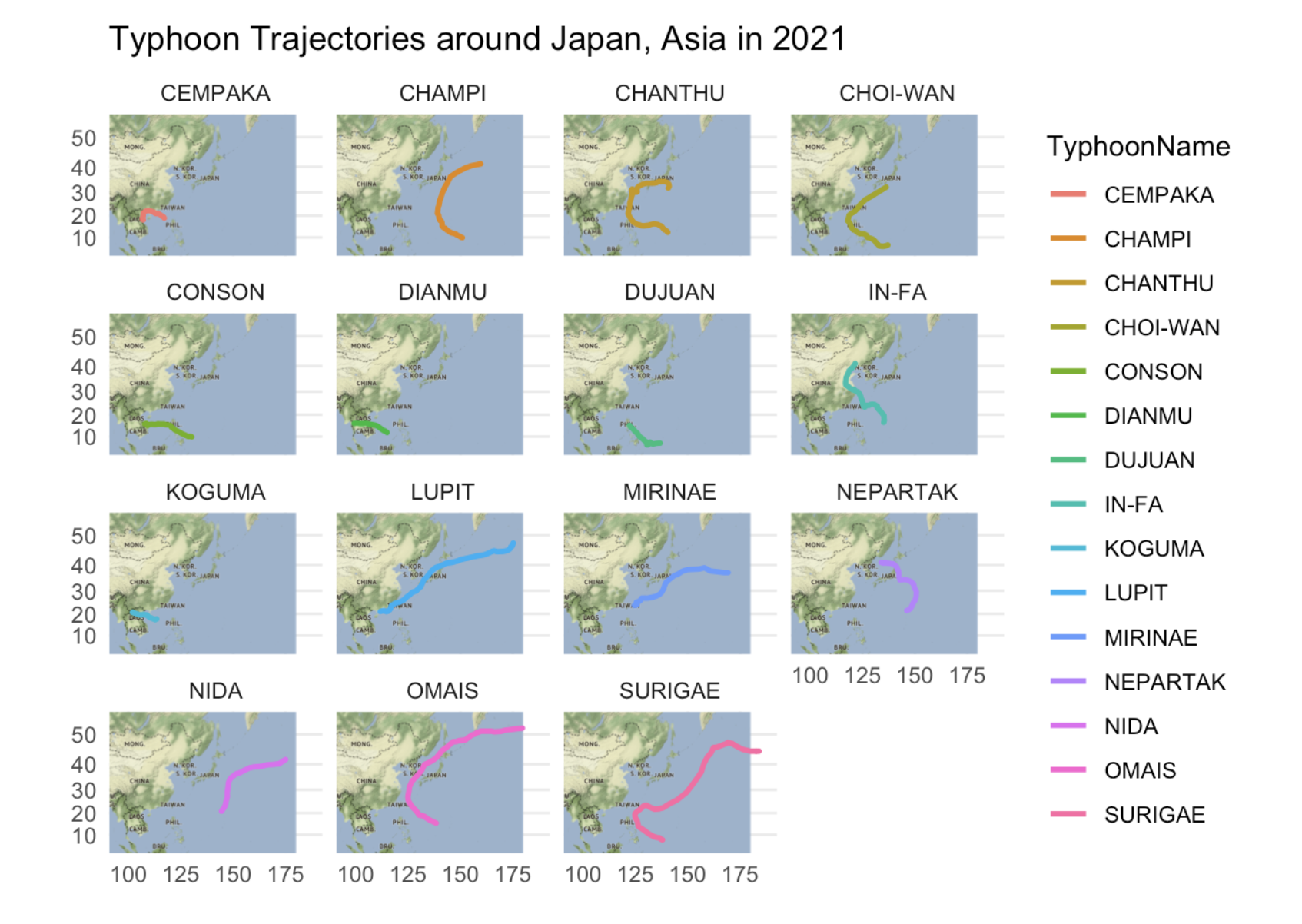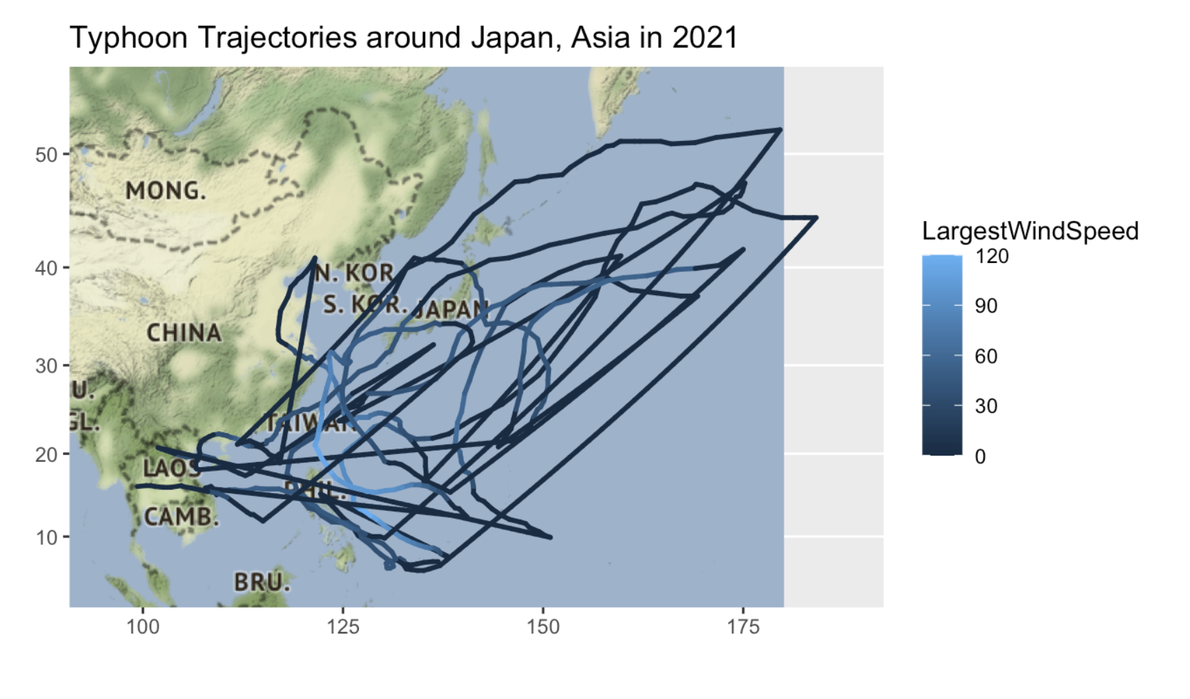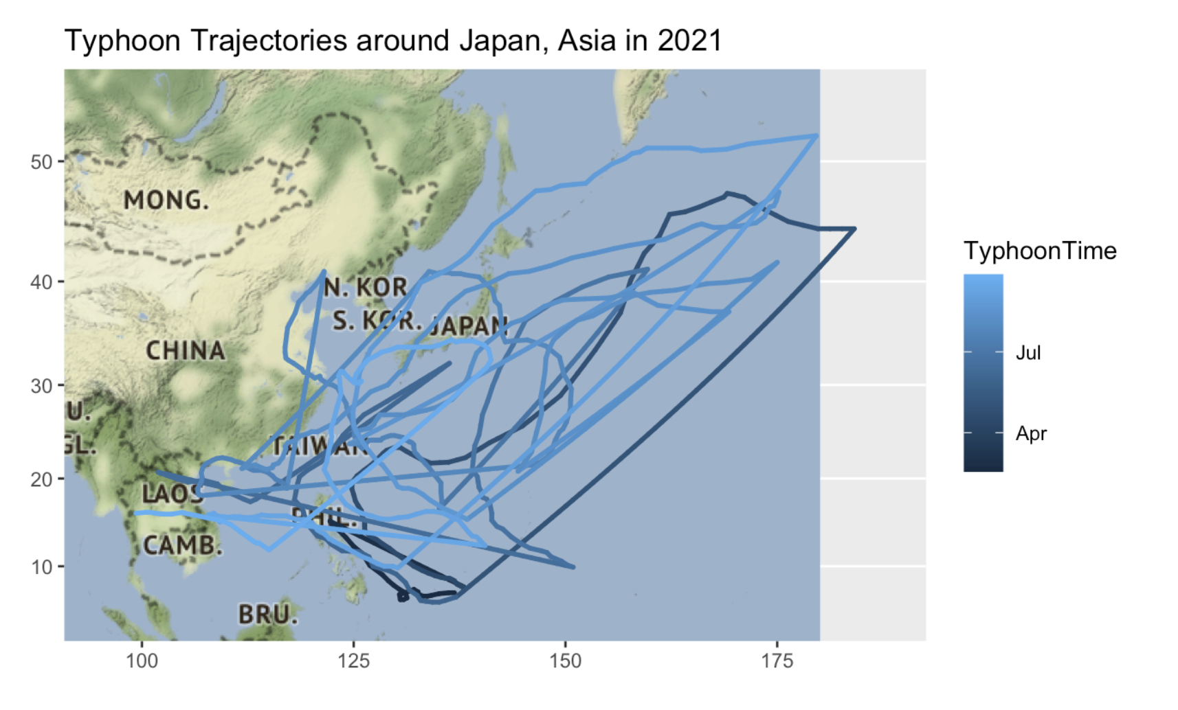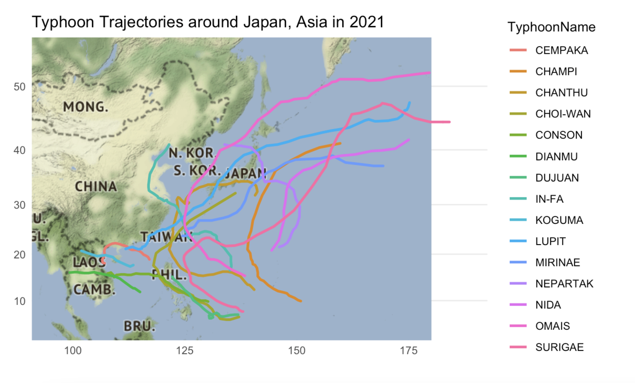The typhoon trajectories data is from the open data plaform of Japan governement. There are 15 typhoons occuring from Feb, 2021 to Sep, 2021 recorded in the data. It start with the name Chempaka and end with Surigae. As showed in the plot, the typhoon occurs near Pacific Ocean in the west of Japan. Each typhoon has different tracks. Some of them turn northward and others turn southward. What I found that is interesting is that in Early summer around July, typhoon appears in Pacific ocean but in the late summer, typhoon appears more east to the land sides. The darker the line is, the earlier the typhoons appear.