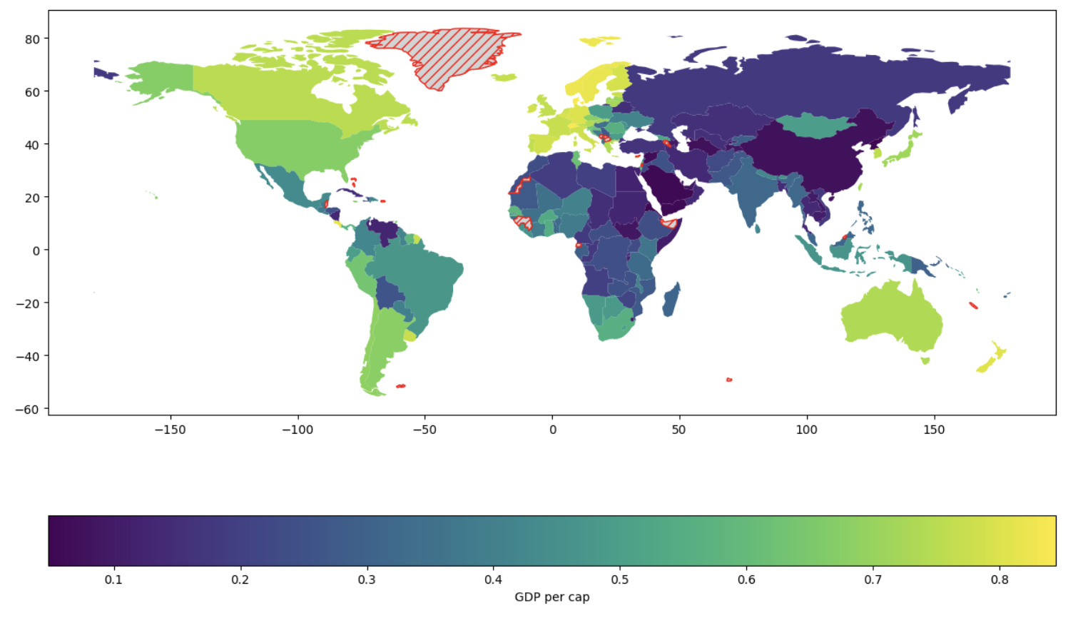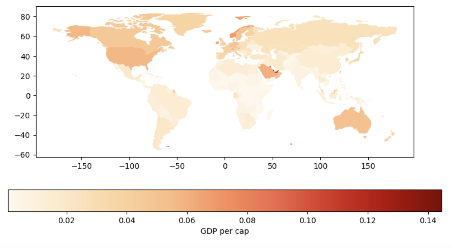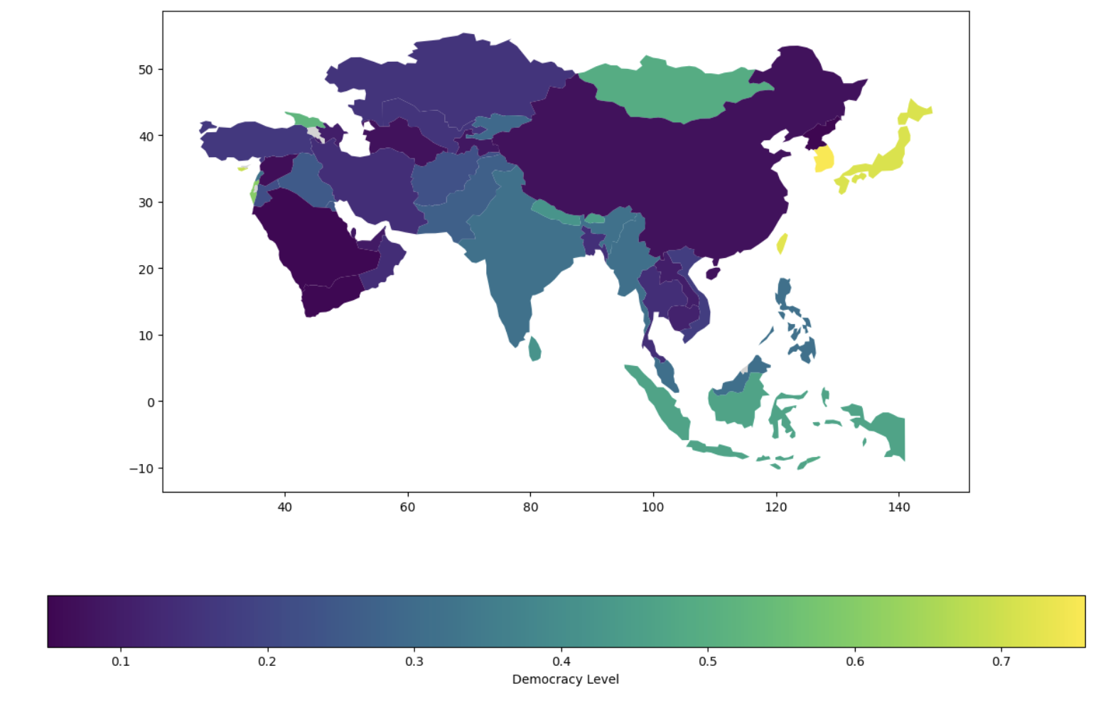 In this project, I utilized Pandas and GeoPandas to process and analyze global polygon layer data, presenting this information through visualized maps that depict the economic conditions and levels of democracy around the world. First, I used Pandas to read and organize economic and democracy data from multiple sources. Then, I combined this data with geographical spatial data using GeoPandas, creating detailed geospatial data frames. Next, I performed operations on the polygon layers to ensure data integrity and accuracy. After processing the data, I employed Matplotlib and other visualization tools to create a series of vivid maps showcasing the economic conditions and democracy levels of various countries. These maps use elements like color, size, and shape to facilitate easy comparison and analysis of differences between countries. This project not only provides a powerful demonstration of data analysis but also uses visualization tools to make complex global economic and political data easy to understand.
