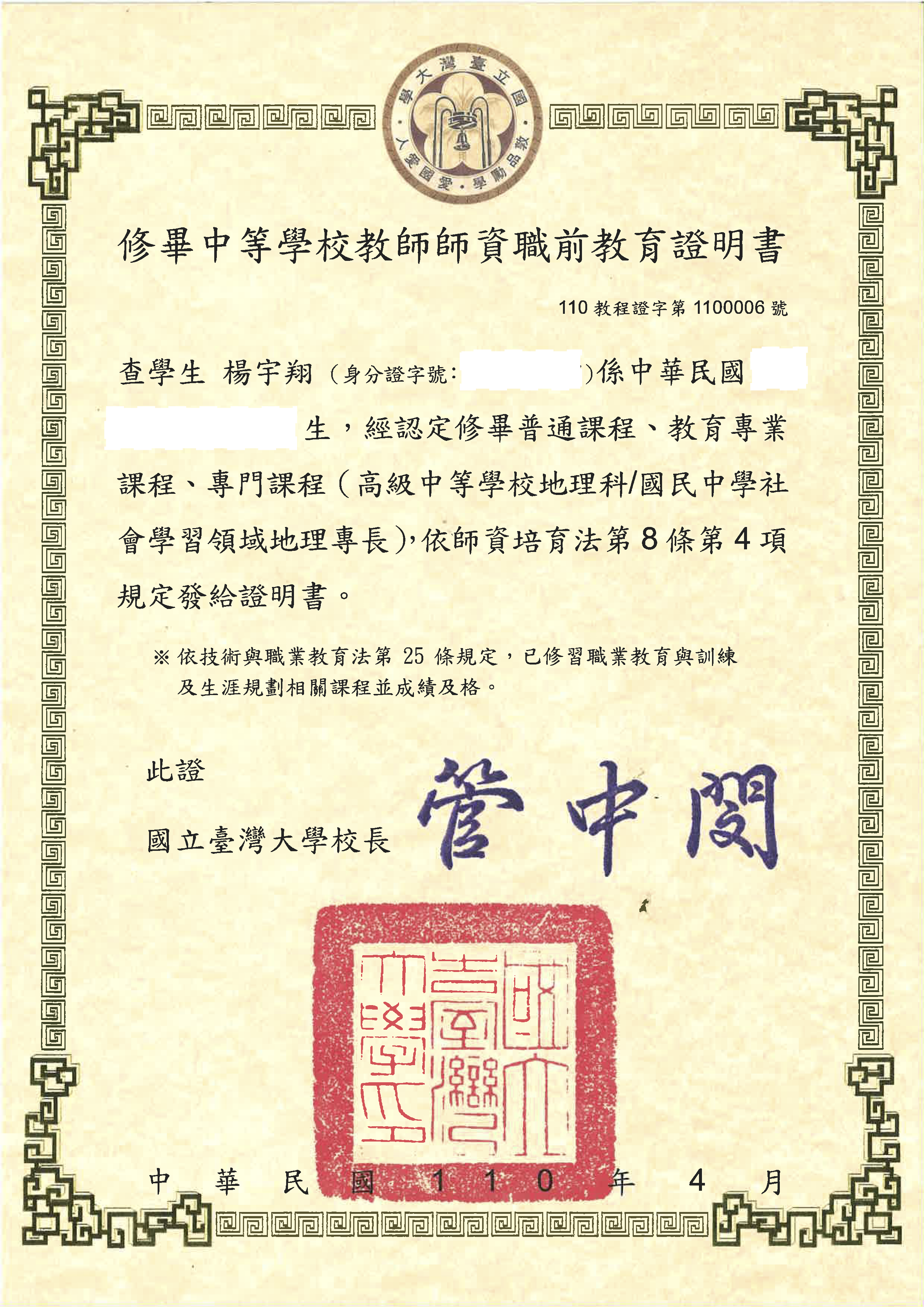 I completed the teacher education program in National Taiwan University.