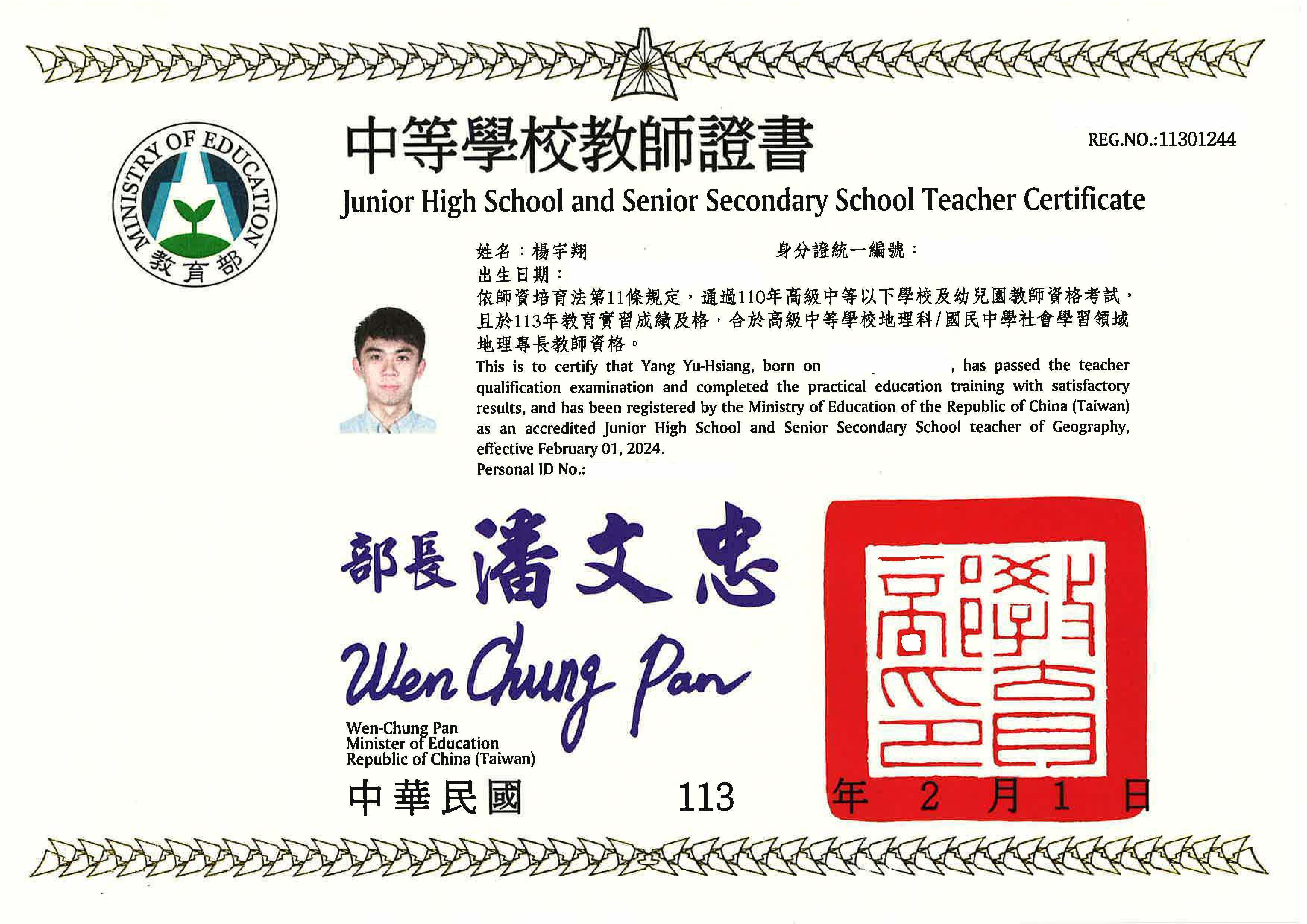 I passed the teacher qualification examination, completed the practical education training and obtained Junior high school and senior secondary school teacher license of Geography.
