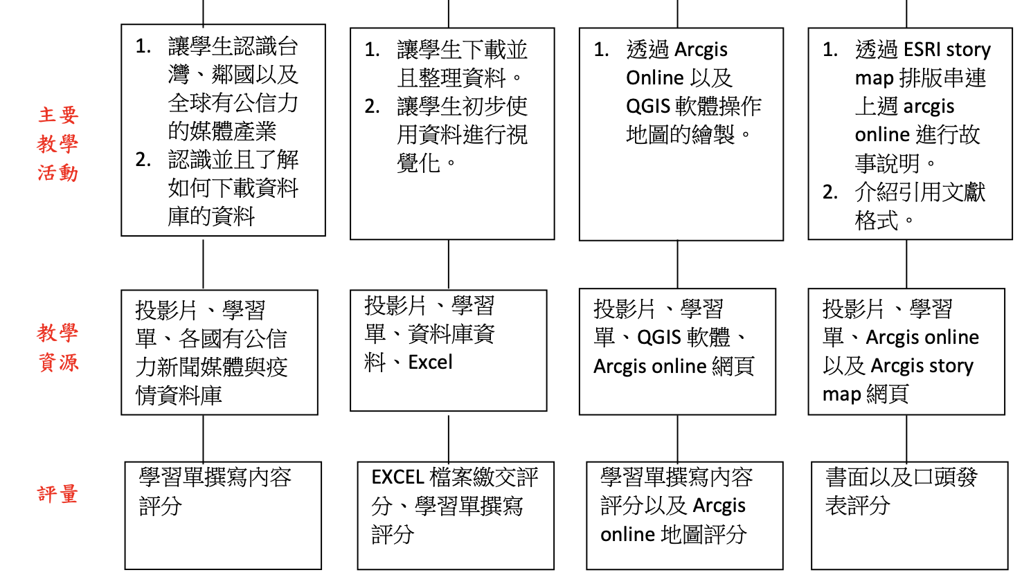 學習內容,主要是希望學生能主動結合與疫情有關各大網路資料庫、透過教師設計 的學習單引導,最後做出一個小組專題。其課程內容主要是學習疫情新聞的媒體釋 讀、判斷、並且學習如何利用網路上的資料庫,下載資料,理解資料格式以及欄位、 並且如何利用軟體處理、清洗資料,最後將資料視覺化成圖表以及地圖進行分析與詮 釋,並且引用文獻,說一個有頭有尾的故事