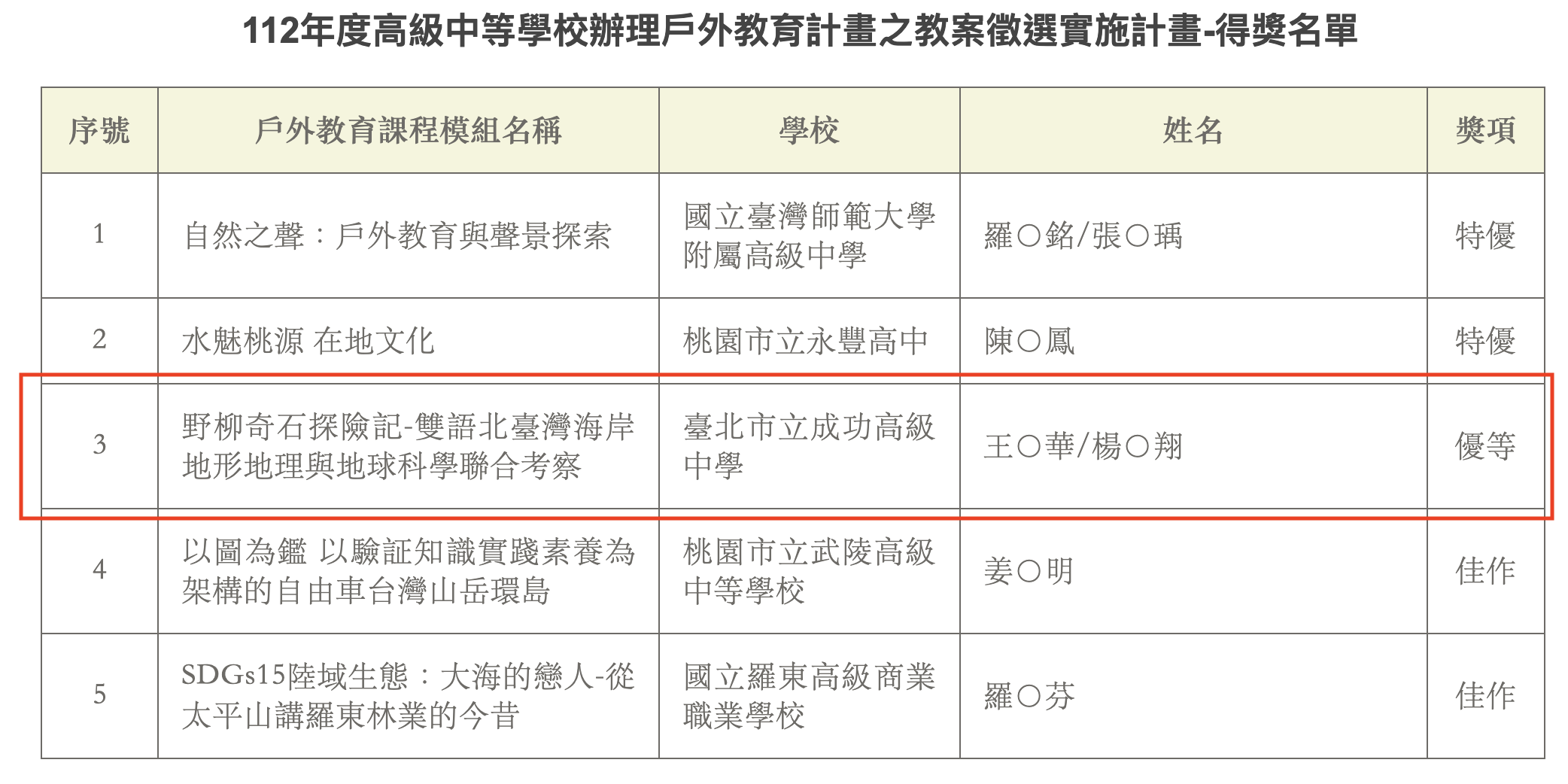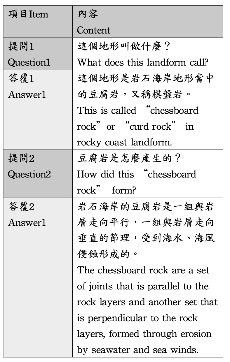 This course combines geography in the social field and earth science in the natural field with marine education. Looking forward to "hearing, smell, vision, touch" through outdoor teaching (but pay attention to the geopark Special rock areas that are not touched (required to abide by regulations)" sensory learning teaching design allows High school students gain a practical understanding of the rocky coastal terrain, offshore ecology and environmental pollution of the North Coast and maintenance, and the development of fishing villages and settlements. In addition, in line with Taiwan's 2030 bilingual nation policy "cultivating Taiwanese talents to connect with the world" The vision of using bilingual skills to add professional skills, this lesson plan also integrates bilingual education, allowing high school students to Students can present the natural topography of Taiwan through bilingual Chinese and English, and have a deeper understanding of the land where they are located. The ability and quality of understanding and how to promote it to the non-Chinese world.