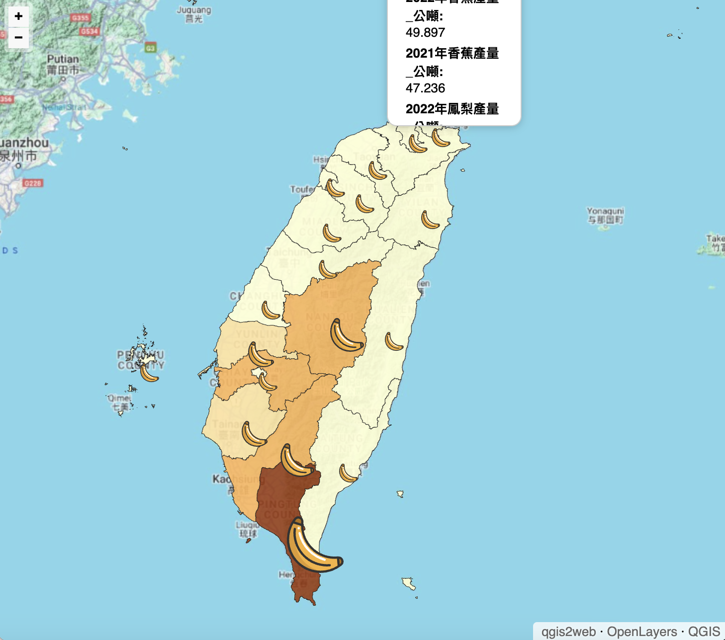 在詮釋地圖方面,繪製後的圓餅圖於地圖上的呈現,可見 2022 年與 2021 年每公頃香蕉產 量的差異,若深 綠色比例大,代 表 2022 年的單位 產量比 2021 高, 可以看到在屏東 縣 2022 年香蕉單 位產量增多,但 是在宜蘭縣香蕉 單位產量減少。呈現 2022 年台灣縣市別的香 蕉的產量(公噸)可以看到屏 東縣為台灣香蕉 產量最高的縣 市,南投縣也很 高。