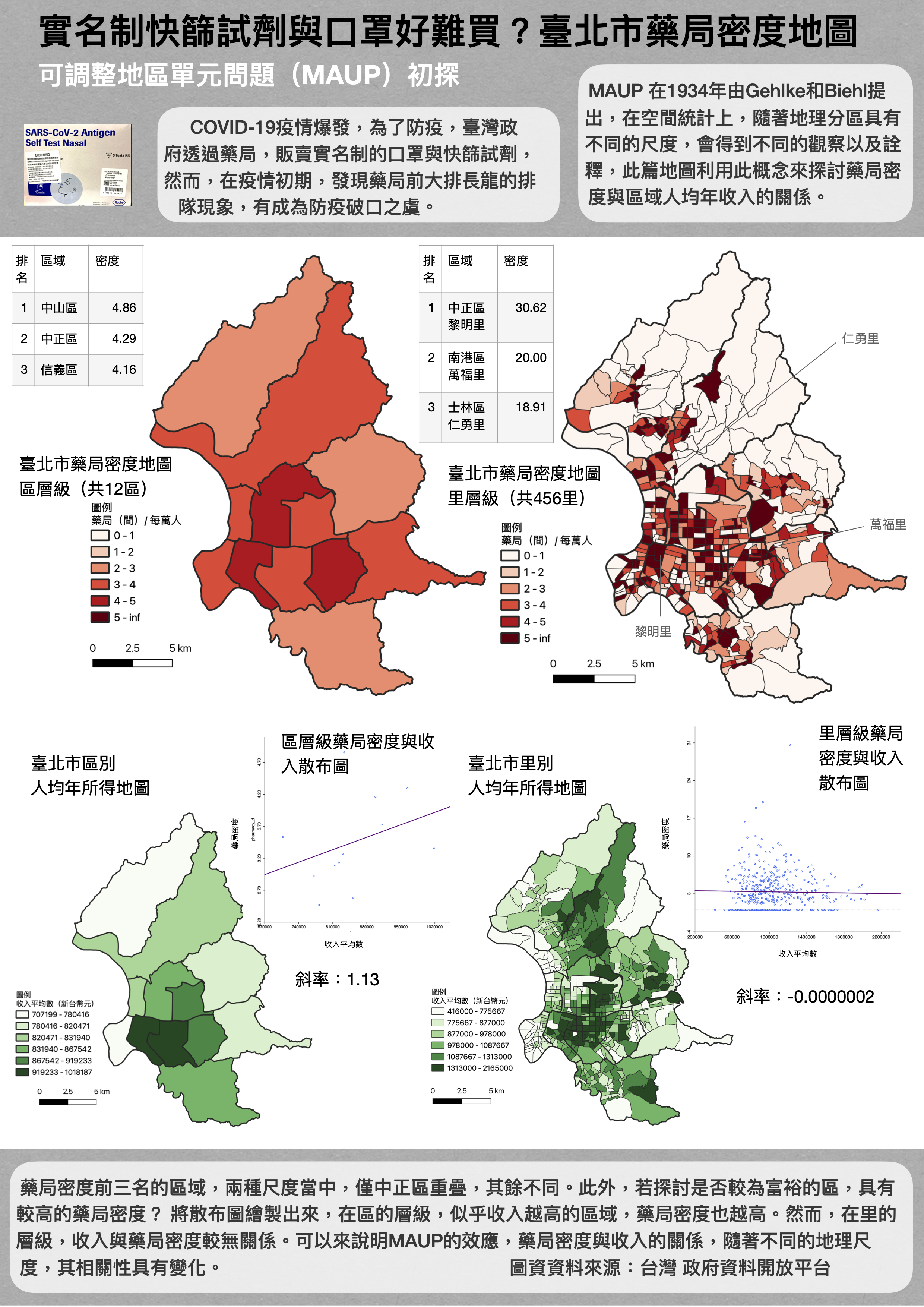 設定「實名制快篩試劑與口罩好難買?臺北市藥局密度地圖,可調整地區單元問題(MAUP)初探」這個主題,主要是利用空間統計上的可調整地區單元問題(MAUP)的概念,呈現臺北市 12 個區以及 456 個里,兩個層級的藥局密度地圖,並且結合居住正義藥局密度與地區收入關係,來呈現收入與藥局密度的關係,隨著關注的地理空間尺度的不同,其關係也有所不同。