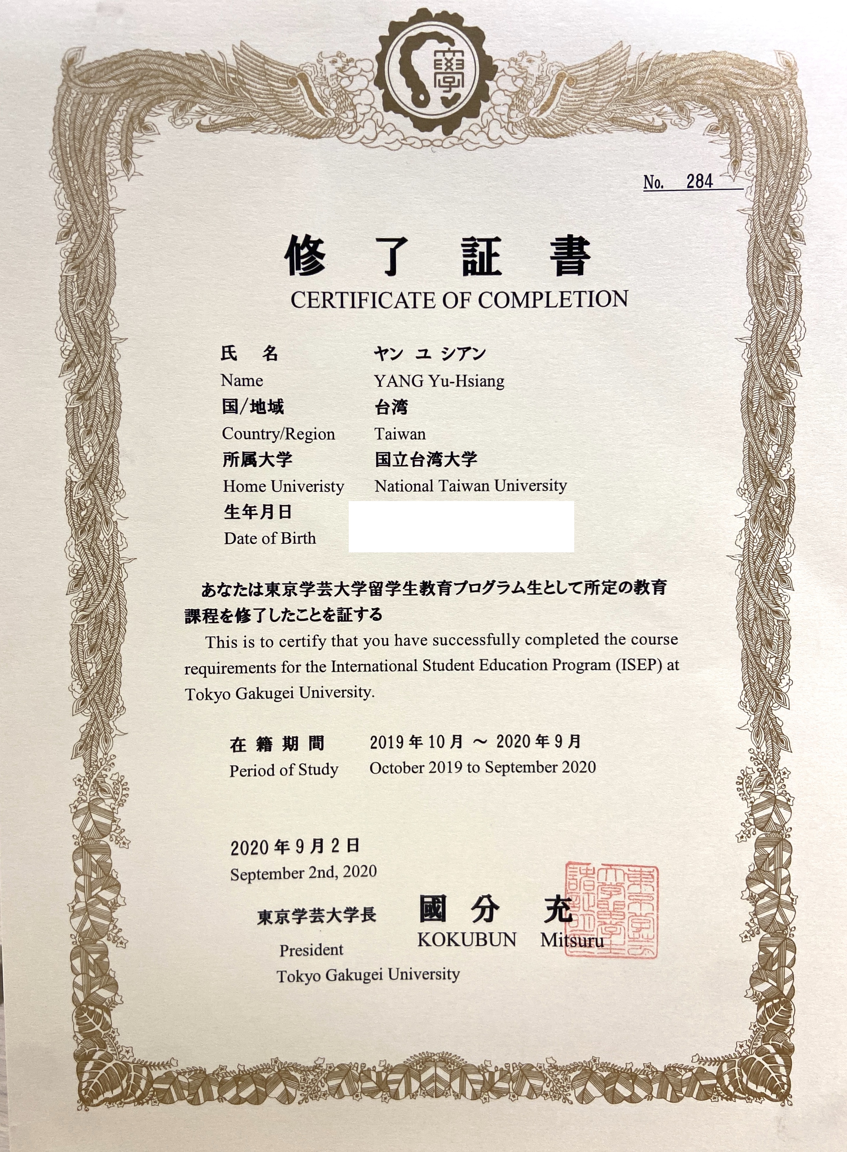 2019-2020 One-year Exchange Student in Tokyo Gakugei University, Japan